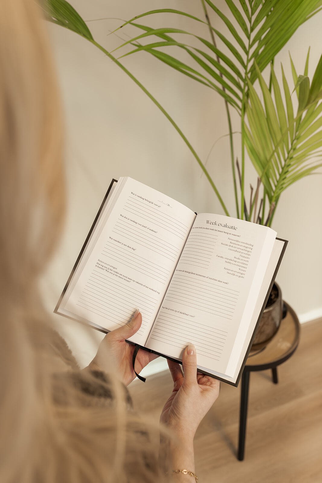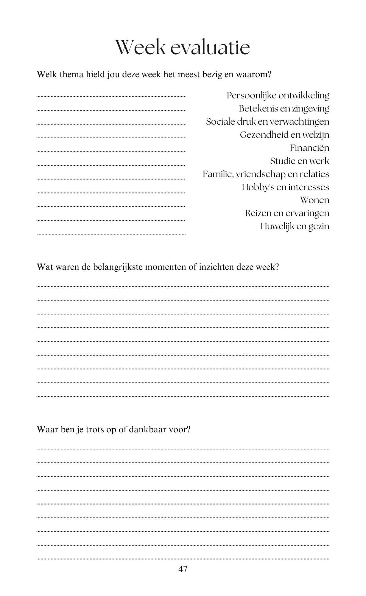 Na elke zevende dag volgt een week- of maandevaluatie. Deze vragen helpen je terugkijken en de week of maand te evalueren.