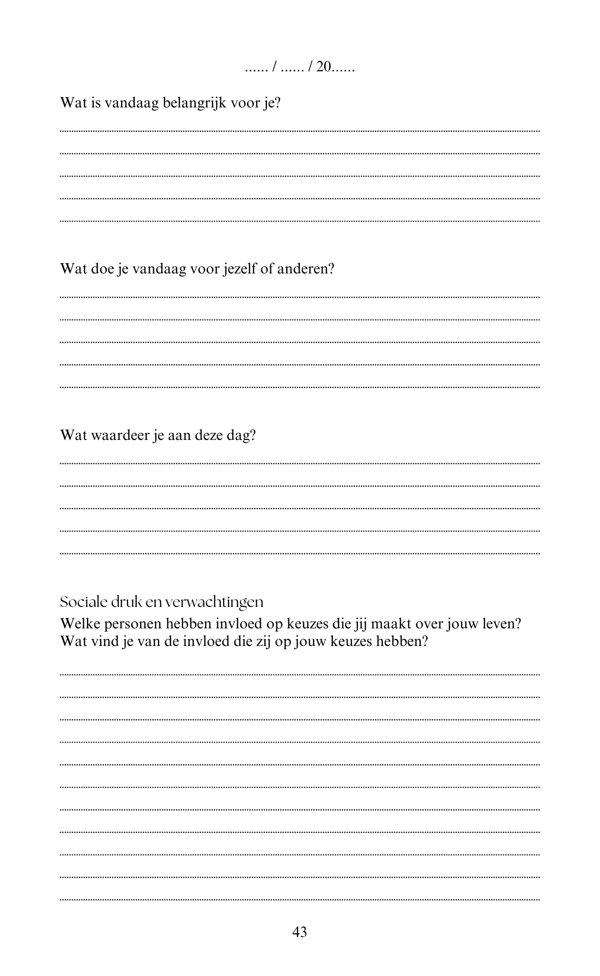 Het journal start met drie opdrachten die je voorbereiden op het dagelijkse schrijfproces. In de eerste opdracht breng je jouw persoonlijke waarden in kaart: wat vind je écht belangrijk en wat wil je vermijden? In de tweede opdracht zoom je in op jouw dagelijks leven. Door een gemiddelde dag en week uit te schrijven, ontdek je patronen en zie je waar je tevreden over bent en wat je zou willen veranderen. In de derde opdracht beschrijf je stap voor stap jouw ideale toekomst. Hierdoor vorm je een eerste beeld van wie je bent, waar je tegenaan loopt en waar je naartoe wilt.